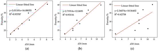 Relationship between porosity and grain sizes: (a) linear analysis between d10 and porosity; (b) linear analysis between d20 and porosity; (c) linear analysis between d30 and porosity.