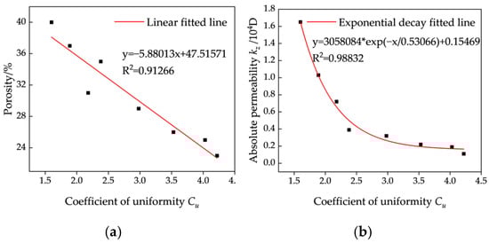 Relationship between porosity and coefficient of uniformity Cu: (a) porosity and coefficient of uniformity Cu; (b) absolute permeability kz and coefficient of uniformity Cu.