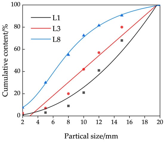 Low-grade copper ore was also used for the graded ore particles. Based on the six particle sizes (G1–G6) of the single-grade ore particles, these sizes served as six factors for test analysis. A uniform design method was adopted to conduct tests at eight levels (L1–L8). Each gradation was combined according to the mass fraction of the ore particles to ensure consistent total sample mass. The percentage content of each particle size at each level is shown in Table 3. In the L1–L8 models, the content of fine particles gradually increased while the proportion of coarse particles changed, forming different gradation combinations. Specifically, L1–L4 and L5–L8 constituted two major control groups, where the content of fine particles progressively increased and the content of coarse particles progressively decreased. Furthermore, the odd-numbered group (L1/L3/L5/L7) and the even-numbered group (L2/L4/L6/L8) formed additional control groups, with the odd-numbered group containing a higher proportion of coarse particles compared with the even-numbered group (L1 > L2/L3 > L4/L5 > L6/L7 > L8).