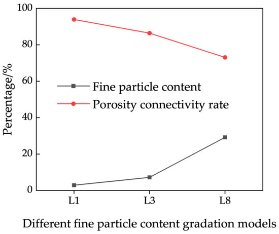 Representative L1, L3, and L8 gradation models were selected to conduct a quantitative analysis of pore structure parameters. In Figure 10, the L1 curve is concave, indicating a high coarse-particle content and a relatively stable solid skeleton formed by coarse particles, allowing fine particles to move within the pores formed by coarse particles. The L3 curve approaches a straight line, indicating a relatively uniform distribution of coarse and fine particles, making fine particles less likely to shift. The L8 curve is convex, indicating a high fine-particle content, much greater than that of the coarse-particle content, making it more difficult for fine particles to migrate. The pore network stick models of the various gradation models are presented in Figure 11. Avizo-based modeling and analysis demonstrate that the connectivity of the L1, L3, and L8 models decreases progressively, with connectivity values of 93.92%, 86.42%, and 73.10%, respectively. The total pore count and the number of isolated pores for these models are summarized in Table 7. These findings suggest that an increase in fine-particle content leads to a more compact packing structure of the ore particle models, which consequently reduces pore network connectivity. Specifically, the fine-particle content in the L3 and L8 models is 2.5 and 10 times that of the L1 model, respectively, resulting in connectivity reductions to 92% and 77.8% of the L1 model’s value. The correlation between fine-particle content and connectivity across the various models is illustrated in Figure 12.