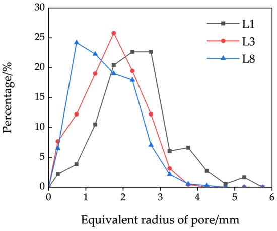 After calculation and analysis, the equivalent diameter distribution of the three-dimensional pores and pore parameters for the different gradation models are shown in Figure 13 and Table 8. It can be observed from the figure that the overall trend of pore-size distribution in the different models is similar: as pore size increases, the percentage of pores first increases and then decreases. However, the peak and average pore sizes differ significantly among the models. For models L1, L3, and L8, the peak pore sizes occur in the ranges of 2.5–3 mm, 1.5–2 mm, and 0.5–1 mm, respectively, with average pore sizes of 2.33 mm, 1.75 mm, and 1.50 mm, respectively. This indicates that as the fine-particle content increases, both the peak and average pore sizes decrease. Furthermore, as shown in Table 6, the number of pores varies significantly among the models. This is because fine particles fill the large pores formed by coarse particles, reducing the pore size while increasing the pore quantity. Model L1 contains a large number of large pores concentrated in the range of 1.5–3 mm, accounting for 65.75% of the total pore count; model L3 contains pores concentrated in the range of 1–2.5 mm, accounting for 64.25% of the total pore count; and model L8 contains a large number of small pores in the range of 0.5–1.5 mm, accounting for 46.47% of the total pore count.