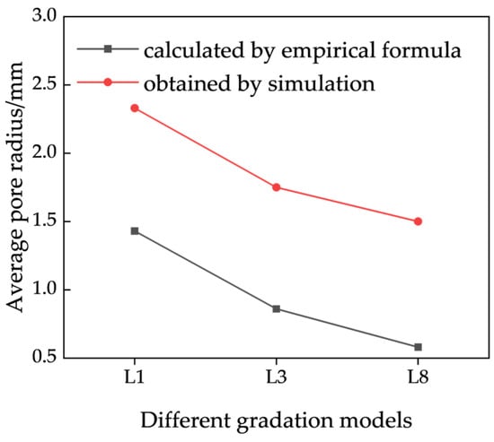 The average diameter of voids in a graded granular medium is primarily influenced by the fine-particle size and the uniformity coefficient of the gradation curve, with the fine-particle size serving as the dominant factor. Both the continuous gradation soil Formula (3) and Pavločić’s Formula (4) establish a relationship between the average equivalent diameter of voids and the fine-particle size. Using the empirical Formula (3), the equivalent diameter of voids was calculated, from which the equivalent radius was derived, as presented in Table 9. When compared with the equivalent radius obtained from the three-dimensional model, the average equivalent radius determined through image analysis was found to be larger than that calculated by the empirical formula, as shown in Figure 14. This discrepancy can be attributed to two main factors: First, the scanning resolution limits the detection of voids smaller than the resolution threshold, which are excluded from the statistical analysis, thereby increasing the average void size. Second, the empirical formula calculates the average throat diameter of the voids rather than accounting for the entire void body, resulting in a smaller computed value. These factors collectively contribute to the observed difference between the two methods.