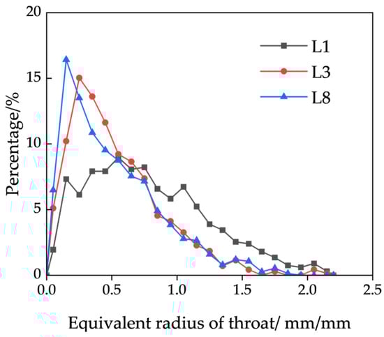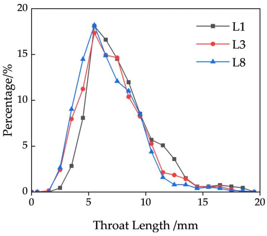 After calculation and statistical analysis, the throat-length distribution of the three models is shown in Figure 16. Throat lengths are concentrated in the range of 4–9 mm. In all three models, the number of throats first increases and then decreases as throat length increases, with peaks occurring at 5–6 mm. When throat length is less than 5 mm, the proportion of throats of each length in models L1, L3, and L8 increases continuously, indicating that the proportion of throats of each length increases with the fine-particle content. When throat length exceeds 6 mm, the overall trend of the proportion of throats of each length in models L1, L3, and L8 decreases with the fine-particle content. The L8 model exhibits a significantly higher number of short throats, with those measuring 6 mm or less accounting for 44.36%, compared with only 29.49% in the L1 model. The average throat lengths for the L1, L3, and L8 models are 7.93 mm, 7.10 mm, and 6.90 mm, respectively, with corresponding standard deviations of 2.93 mm, 2.72 mm, and 2.46 mm. These results suggest that an increase in fine-particle content leads to a higher proportion of short throats, a narrower distribution range of throat lengths, and a reduction in average throat length, which may effectively shorten the flow path of the solution. However, the overall seepage performance must be evaluated in conjunction with throat-size characteristics to obtain a comprehensive understanding.