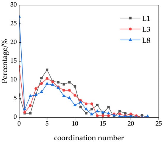 - The changes in pore coordination number were analyzed based on the gradation models. The overall trend for pore coordination number changes was consistent among the different gradation models. Notably, the L8 model exhibited a significantly higher concentration of pores with small coordination numbers. Specifically, 26.90% of the pores had a coordination number of 0, indicating a high proportion of isolated pores and poor connectivity within the model. When the coordination number was less than 2, the L8 model showed a higher proportion of pores compared with the L1 and L3 models. The proportion of pores with coordination numbers of below 2 in the L8 model reached 34.78%, whereas it was only 8.29% in L1 and 18.09% in L3. After excluding pores with a coordination number of 0, the peak proportion for all three models occurred at a coordination number of 6. Furthermore, when the coordination number ranged from 4 to 11, the proportion of each coordination number followed the order L1 > L3 > L8, with cumulative percentages of 72.38%, 65.61%, and 52.71%, respectively.
