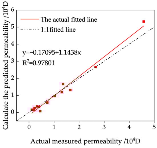 In this study, pore structure parameters include porosity, equivalent pore diameter, equivalent throat diameter, throat length, pore coordination number, and pore connectivity. Following three-dimensional modeling and reconstruction analysis, it was determined that the connectivity of all the models exceeds 97%. Consequently, pore connectivity was excluded from the analysis of permeability-influencing factors. Using the aforementioned five pore structure parameters as independent variables and permeability as the dependent variable, a multiple linear regression fitting was conducted. The resulting model equation is as follows: