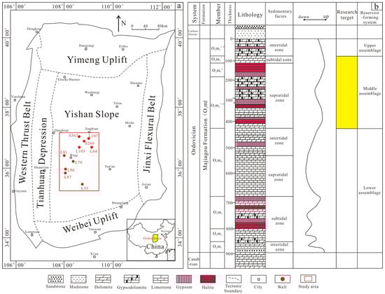 (a) Division of tectonic units in Ordos Basin and the location of the study area (modified after [31]); (b) stratigraphic column of the Majiagou Formation (modified after [15]).