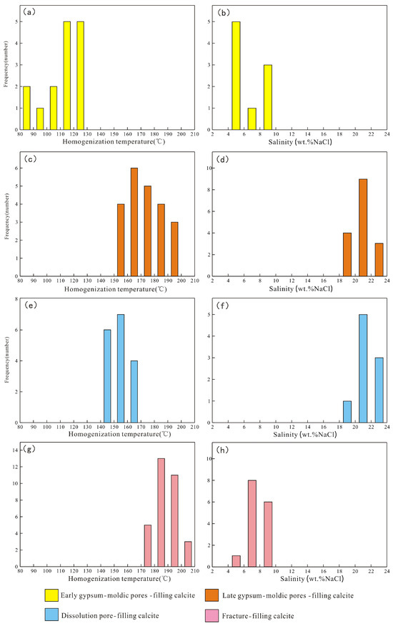 The distribution of the homogenization temperature and ice melting temperature of the two-phase liquid–vapor aqueous inclusions in the pre-salt reservoir of the Majiagou Formation. (a) Homogenization temperature of early gypsum-moldic pore-filling calcite. (b) Salinity of early gypsum-moldic pore-filling calcite. (c) Homogenization temperature of late gypsum-moldic pore-filling calcite. (d) Salinity of late gypsum-moldic pore-filling calcite. (e) Homogenization temperature of dissolution pore-filling calcite. (f) Salinity of dissolution pore-filling calcite. (g) Homogenization temperature of fracture-filling calcite. (h) Salinity of fracture-filling calcite.