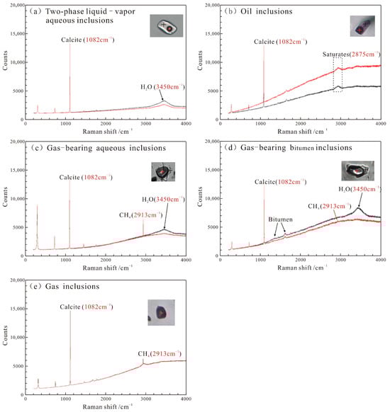 In this study, laser Raman spectroscopy test was carried out on different types of fluid inclusions classified by the petrography characteristics. The results show that H2O was detected in both the bubbles and the liquid phase of the fluid inclusions (Figure 6a), confirming the two-phase liquid–vapor aqueous inclusions. The saturated hydrocarbons were detected in both the bubbles and the liquid phase of the oil inclusions (Figure 6b), further confirming the liquid oil inclusions. In the gas-bearing aqueous inclusions, significant CH4 was detected in the bubbles, while H2O was also detected in the liquid phase (Figure 6c), indicating the CH4-containing aqueous inclusions. In addition, a small amount of bitumen was detected in the liquid phase of some gas-bearing aqueous inclusions (Figure 6d). Finally, only CH4 signals were detected in the pure gas inclusions (Figure 6e), confirming the pure CH4 inclusions.
