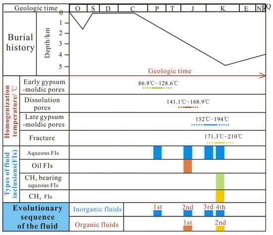 According to previous studies on the diagenetic sequence of the Majiagou Formation in the Ordos Basin [41,42,43], the secondary calcite of the Majiagou Formation developed during the burial stage of the strata, during which the temperature at this stage increased over time. Primary fluid inclusions in the minerals were formed simultaneously with the mineral [44,45], so the homogenization temperature of the primary two-phase liquid–vapor aqueous inclusions in the minerals can indicate the temperature when the minerals formed [45,46]. The homogenization temperatures of two-phase liquid–vapor aqueous inclusions in the early gypsum-moldic pore-filling calcite, dissolution pore-filling calcite, late gypsum-moldic pore-filling calcite and fracture-filling calcite are mainly distributed between 110 and 130 °C, 140 and 160 °C, 160 and 180 °C and 180 and 200 °C, respectively, indicating that the formation temperature gradually increased and the formation time became later. Thus, it can be concluded that these four types of cements sequentially represent four different stages of inorganic fluid activity. In addition, two stages of organic fluid activity are symbiotic with the second and fourth stages of inorganic fluid activity, respectively (Figure 7).