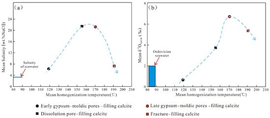 (a): Cross-plot of the salinity vs. homogenization temperature. (b): Cross-plot of the oxygen isotopes vs. homogenization temperature (the δ18OSMOW of the Ordovician seawater was modified after [54]).