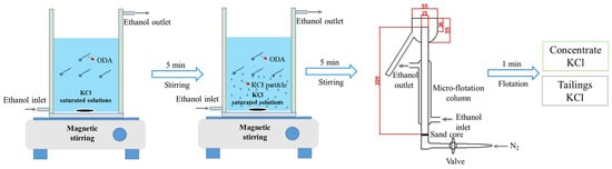 The KCl micro-flotation experiments procedure is shown in Figure 1. The custom-built laboratory micro-flotation column has an internal volume of 120 mL and is designed for external connection to a circulating water bath (DC-2006 Energy-saving Intelligent Thermostat, Ningbo Xinzhi Biotechnology Co., Ltd., Ningbo, China) to precisely control the flotation temperature. A sintered glass disc (pore size: 5–15 μm) is embedded at the bottom of the column to generate fine gas bubbles. For each micro-flotation test, a specified volume of ODA aqueous solution (0.01 mol/L) was transferred via micropipette into 120 mL of the saturated KCl solution. The mixture was magnetically stirred (60 rpm) for 5 min to ensure homogeneity. Subsequently, 3 g of solid KCl (80–100 mesh) was added, followed by an additional 5 min of stirring. This procedure is termed pulp conditioning. The conditioned pulp was then rapidly transferred into the micro-flotation column. While under magnetic stirring, nitrogen gas was introduced through the bottom disc at a flow rate of 10 mL/min for a flotation duration of 1 min. The temperature throughout both the pulp conditioning and flotation stages was maintained at setting temperature via the external circulating bath, using a water/ethanol mixture as the heat transfer fluid. The condition of KCl flotation was shown in Table 1. Following flotation, the concentrate (floated KCl) and tailings (remaining KCl) was collected by filtration. Both fractions were dried at 110 °C for 4 h. The dry weights of the concentrate and tailings were measured separately. To account for potential dissolution or crystallization of KCl due to minor temperature fluctuations during handling, the flotation recovery was calculated using the following formula.