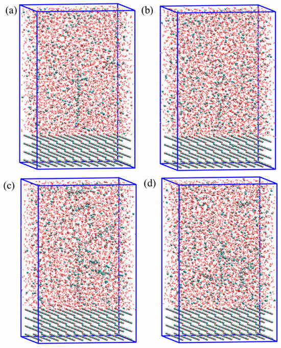 As shown in Figure 2, the KCl (1 0 0) was fixed on the bottom. The thickness of the crystal is about 0.943 nm. A total of 4200 H2O molecules were inserted into the top of the simulation box, where x = 3.77 nm, y = 3.77 nm, and z = 6.00 nm. The composition and simulation temperature of each system was shown in Table 2.