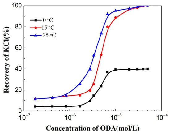 Temperature is a key parameter during the KCl flotation; therefore, the micro-flotation experiment was conducted to assess the effect of temperature on KCl flotation recovery under varied ODA concentration (Figure 3). The results indicated that the KCl flotation recovery decreased with declining flotation temperature. The KCl flotation recovery exhibits an initial slow increase, followed by a sharp rise, and finally levels off as the ODA concentration increases at 25 °C. When the ODA concentration is 1 × 10−5 mol/L, the flotation recovery is about 95%. This finding aligns substantially with literature reports [7]. When the flotation temperature is reduced to 15 °C, the KCl flotation recovery presents a slight decrease compared to 25 °C, but with a similar trend. About 89% KCl recovery can still be achieved with the ODA concentration of 1 × 10−5 mol/L. However, it is noteworthy that the maximum KCl flotation recovery is only approximately 40% at a temperature of 0 °C and an ODA concentration of 1 × 10−5 mol/L. Furthermore, further increasing ODA concentration yields only slight improvements in KCl recovery at 0 °C. The underlying reasons for this behavior are likely attributable to the solution chemistry of the flotation system being influenced by a low temperature.