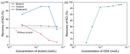 Based on the aforementioned KCl flotation tests (Figure 3), the influence of alcohol content on the KCl flotation recovery was investigated at 25 °C under the fixed ODA concentration of 3 × 10−6 mol/L (Figure 4a). The results indicated that the butanol only slightly enhanced the KCl flotation recovery. As the butanol concentration increased, the KCl flotation recovery showed no significant change. However, the KCl flotation recovery increased first and decreased subsequently with increasing the concentration of octanol. Once the concentration of octanol exceeded 5 × 10−6 mol/L, the KCl recovery was lower than that of pure ODA system. However, with the alcohol chain increase, the KCl flotation recovery enhanced first and then decreased with the concentration of dodecanol (DOD). The maximum KCl flotation recovery reached approximately 90% with a DOD concentration of 1.5 × 10−5 mol/L, representing an improvement of about 125% compared to the recovery achieved under pure ODA conditions. However, the KCl flotation recovery began to decline with further increasing the DOD concentration. This suggests that the ODA-DOD collector has a suitable ratio for optimal KCl flotation performance.