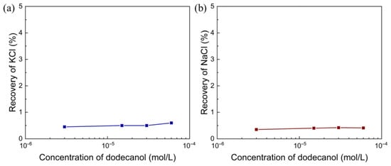 Figure 5. (a) KCl flotation recovery with the DOD concentration without ODA at 0 °C and (b) NaCl flotation recovery with the DOD concentration at 0 °C under a fixed ODA concentration of 3 × 10−6 mol/L.