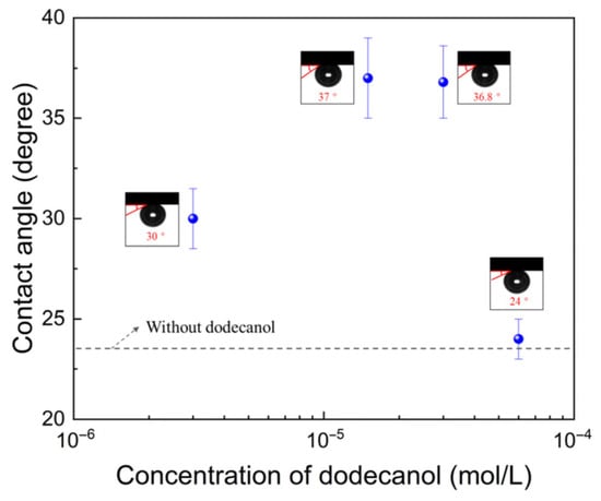 Figure 6. The contact angle of KCl crystal with the DOD concentration at 0 °C under a fixed ODA concentration of 3 × 10−6 mol/L.