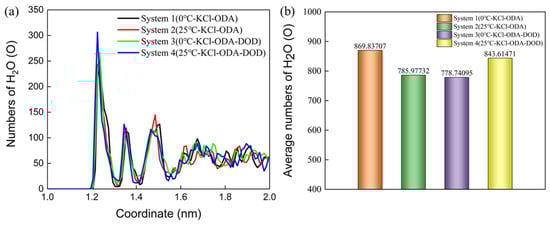 The number of water molecules within the hydration layer for different systems was further calculated (Figure 7b). The data show that in System 1 (0 °C), the number of water molecules within the hydration layer is about 9.5% higher than in System 2 (25 °C). This increase is likely attributable to the lower kinetic energy of water molecules at low temperature (0 °C), making them more readily attracted to the KCl surface. Furthermore, at low temperatures, the tendency of water molecules towards disorder (the entropy-driven force) is reduced, favoring a more ordered arrangement around the ions and the formation of a denser hydration layer. Conversely, elevated temperature increases the thermal motion of water molecules, leading to partial desorption and consequently reducing the number of water molecules within the hydration layer. When DOD is present in the system (System 4), the number of water molecules within the hydration layer increases by approximately 8.3% compared to System 3 (which lacks DOD at 25 °C).