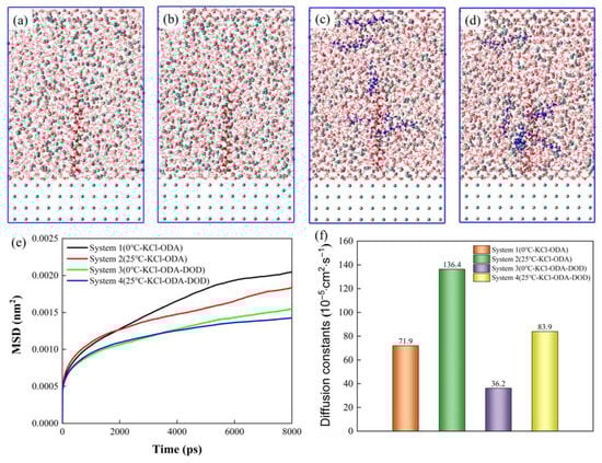 Figure 8a–d depict the initial configurations of the simulated systems. Figure 8e shows the MSD curves of water molecules within the hydrated layer of the KCl crystal surface. The corresponding diffusion coefficients are presented in Figure 8f. The results show that the mobility of water molecules in the hydrated layer of System 1 is lower than that in System 2. This indicates that the mobility of water molecules at 0 °C was lower compared to 25 °C in the same simulated system. This difference is attributed to the lower energy and diminished thermal motion of water molecules at lower temperatures. At 0 °C, the presence of DOD in System 3 further reduces the diffusion coefficient of water molecules in the hydrated layer compared to System 1. This decrease in diffusion coefficient likely results from the formation of hydrogen bonds between DOD and water molecules, which restricts the diffusion of water.