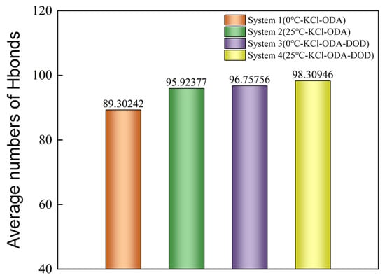 To further prove the aforementioned results, the average number of hydrogen bonds per water molecule within the hydration layer of different systems was calculated (Figure 9). The data reveal that the average number of hydrogen bonds per water molecule in the hydration layer of System 1 is lower than in System 2. This reduction is likely attributable to the periodic arrangement of ions (K+, Cl) on the KCl crystal surface, which disrupts the tetrahedral hydrogen-bonding network characteristic of bulk water. At low temperature (0 °C), adsorbed water molecules, forced to conform to the ionic surface sites, sacrifice some H2O-H2O hydrogen bonds. At 25 °C, enhanced thermal motion of water molecules allows for dynamic adjustments that partially restore a more ideal hydrogen-bonding configuration, resulting in a higher average hydrogen bond count. At 0 °C, the number of hydrogen bonds per water molecule in the hydration layer of System 3 increased by 8.3% compared to System 1. This finding further corroborates the result (Figure 8f) that the presence of DOD reduces the diffusion coefficient of water molecules within the hydration layer on the KCl crystal surface in System 3.
