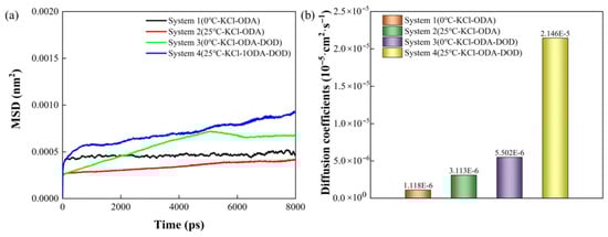 The interaction between ODA and KCl is a crucial step in the KCl flotation process. Therefore, understanding the dynamic behavior of ODA molecules provides deeper insights into the KCl flotation mechanism. Figure 10a displays the mean square displacement (MSD) curves of ODA molecules across all simulated systems, with the corresponding diffusion coefficients (D) shown in Figure 10b. As seen in Figure 10, at 0 °C, the presence of DOD results in a higher diffusion coefficient for ODA molecules in System 3 compared to the system without DOD (System 1). This higher diffusion coefficient consequently increases the contact probability between ODA molecules and the KCl crystal, thereby facilitating their adsorption onto the KCl surface. Simultaneously, ODA molecules exhibit greater mobility at 25 °C than at 0 °C, owing to their higher molecular energy and enhanced thermal motion at the elevated temperature.