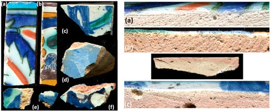 Top view (left) and sections (right) of the sherds: (a) Tekfur Palace tile fragment (Tek) and its section; (b) Qallaline tile rectangular fragment (Q) and its section (with full view of the sherd showing the pink and cream layers); (c) Sidi Ali Azzuz Zaghouan mausoleum fragment (AZ) and its section; (d) Italian sherd (It); (e) Sidi Ali Azzuz Tunis mausoleum fragments P1 and P3; and (f) fragment P2 (Sidi Ali Azzuz Zaghouan mausoleum).