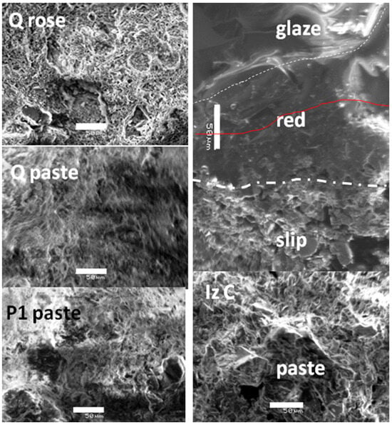 The high clay content in the Qallaline-type tiles results in a texture that visually retains traces of the forming process, such as residual deformation patterns in the paste-clear indicators of a clay-based body. In contrast, the Iznik paste exhibits a more homogeneous structure with grain sizes ranging from 10 to 20 µm, as inferred from the voids left by grains on the fracture surface. Closer inspection of a red-decorated area reveals a superficial, transparent enamel layer approximately 50–100 µm thick, overlaying, for example, a red granular mixture applied on a siliceous slip, which is characteristic of Iznik production [,,,,,,,,,].