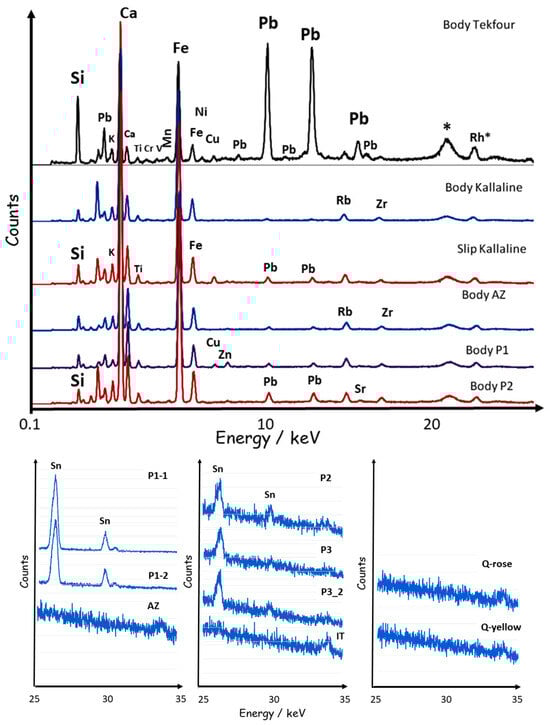 Comparison of representative XRF spectra recorded between 0.1 and 25 and between 25 and 35 keV on the body of Tekfur, Qallaline white (Body Kallaline) and rose (Slip Kallaline), Sidi Ali Azzuz mausoleum (Tunis, AZ and P1), and Sidi Ali Azzuz mausoleum (Zaghouan, P2, P3) sherds. Peaks marked with * are due to the Compton effect (broad) and those marked Rh* (narrow) the components of the rhodium anticathode.