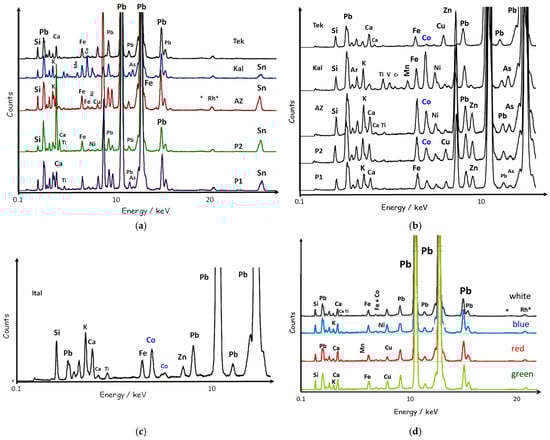 Figure 5 presents representative XRF spectra recorded on the surface of the colored glaze areas. The spectra of the white glazes (Figure 5a) indicate the use of tin as an opacifier in Tunisian ceramics, consistent with previous analyses of utensil sherds attributed to the Qallaline kilns [], and also reveal traces of barium. Cassiterite opacification of lead enamels has been practiced by potters in the Islamic world since the Abbasid Dynasty (9th century) []. The Qallaline sherd also displays arsenic, similar to the P1 sherd. These white areas are partially contaminated by adjacent colored zones (Figure 1), which may contribute to these additional elemental signals.