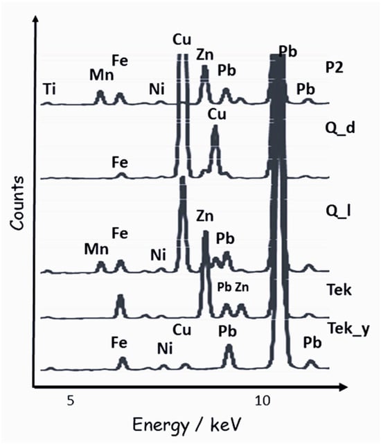 Comparison of representative XRF spectra recorded on Qallaline (Q, d: black defect and l: dark line), Sidi Ali Azzuz mausoleum (Zaghouan, P2), Tekfur Palace (Tek) black zones; additionally, the spectrum of the yellow Tekfur zone (Tek_y) is shown.