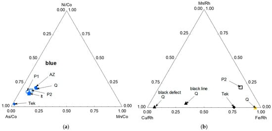 Comparison of XRF peak area of elements associated with cobalt in cobalt ores: (a) Ni, As, and Mn measured on blue zones of studied sherds; data were normalized by the cobalt signal. (b) Comparison of XRF peak area of elements Mn, Cu, and Fe measured on ‘black’ zones and lines; data were normalized by the rhodium anticathode signal.
