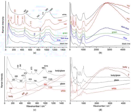 By contrast, the Raman spectrum (Figure 8c,d) of the Italian sherd (It) is markedly different. Its glaze features a main SiO4 stretching component between 980 and 1000 cm−1, consistent with lead-based glass, and a second component at ~1125 cm−1 according to the content of alkalis. A doublet at 675–1015 cm−1 matches low-calcium pyroxene (enstatite) [,], in line with high calcium levels found in both body and glaze (Table 2 and Table 3). Anatase form of TiO2 (main peak at 144 cm−1) is also detected []. The body shows stoneware characteristics, including a broad SiO4 bending band around 480 cm−1 associated with a quasi-mullitic glassy phase [,], and a feldspar peak at 508 cm−1. Peaks at 285, 473, 573, and 633 cm−1 match substituted tin oxide [], a 20th-century blue coloring pigment. The absence of fluorescence supports modern production, i.e., 20th century. The body can be qualified as stoneware, not terracotta.