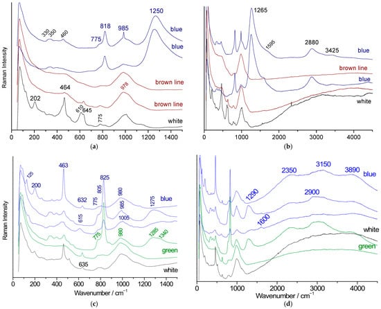 The white areas exhibit a spectrum showing the cassiterite doublet (630–775 cm−1) [,]; this opacifier, which forms the basis of the opacification of Islamic pottery and later of majolica and faience [], is also detected in the green and blue zones. The fluorescence background is similar across all colors, indicating the use of the same primary raw materials in glaze preparation.