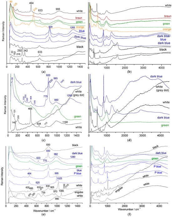 Raman analysis was conducted using a Labram HR800 spectrometer (HORIBA Scientific Jobin-Yvon, Palaiseaur, France), with excitation provided by an Ar+ ion plasma laser (Innova I90C 6UV, Coherent Inc., Santa Clara, CA, USA). The 457.9 and 514.5 nm lines were used with laser powers ranging from ~0.3 mW (for colored enamels) to 8 mW (for paste) at the sample surface. Spectra were acquired using a 50× long working distance (LWD = 13 mm, NA = 0.45) objective (Olympus, Tokyo, Japan). Each analyzed spot measured ~5 × 5 µm2, consistent with expected pigment grain sizes. Penetration depth was uniform in colorless glazes but lower in dark-colored zones.