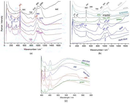 Representative Raman spectra of Tek sherd glazes recorded using a blue laser: (a) red area, examination of the glazed section; (b) other colored areas, section analysis; (c) full spectral range expressed in absolute nm scale for the measurement of the maxima of fluorescence components.