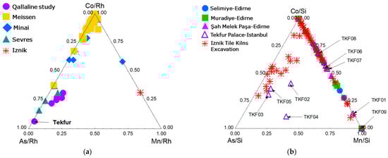 A comparison with the peak area ratios shown in Figure 12 indicates that the cobalt used at Qallaline differs from that used contemporaneously in Meissen (Saxony), as well as from that used in the decoration of Iznik tiles produced one or two centuries earlier, which themselves are comparable to the cobalt used in Persian mīnā’ī ware. The As, Ni, and Mn contents in the Qallaline samples are closer to those of the cobalt used at the Royal Manufacture of Sèvres, which is believed to have originated from the Giftain Valley in Catalonia. This is consistent with the ancient links with Spain. In fact, the presence of associated elements depends not only on the geological context but also on the separation and purification treatments applied [,].