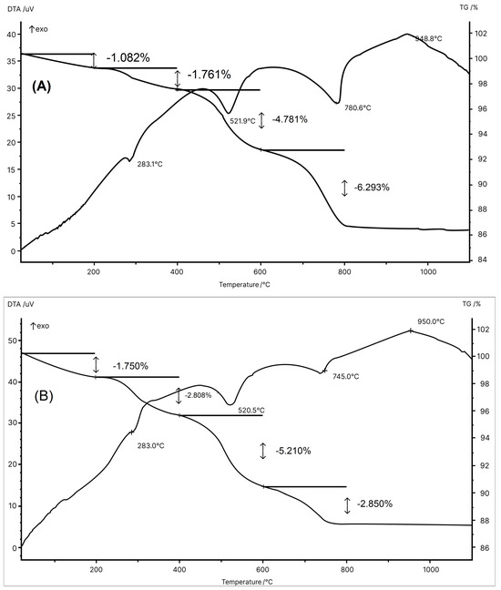 Figure 3 shows the thermal behavior of the MIA1 Paste (STP sludge-free) and the MIA3 Paste (with 10 wt.% STP sludge). Both pastes presented thermal behavior very similar to and typical of ceramic pastes used in wall tile manufacture [45]. The thermal behavior illustrated by the DTA-TG curves in Figure 3 can be described as follows: (a) small endothermic events at ~120 °C with a mass loss of 1.082% (MIA1 Paste) and at ~130 °C with a mass loss of 1.750% (MIA3 Paste) due to the release of physically adsorbed water [33,45]; (b) endothermic events at 283.1 °C with a mass loss of 1.761% (MIA1 Paste) and at 283.0 °C with a mass loss of 2.806% (MIA3 Paste) are related to the dehydration of hydroxides (gibbsite and goethite) [40]; (c) endothermic events at 521.9 °C with mass loss of 4.781% (MIA1 Paste) and at 520.5 °C with mass loss of 5.210% (MIA3 Paste) related to the dehydroxylation of kaolinite to form amorphous metakaolinite [33,40,45]; (d) endothermic events at 780.6 °C with a mass loss of 6.293% (MIA1 Paste) and at 745.0 °C with a mass loss of 2.850% (MIA3 Paste) attributed to the decomposition of carbonates (calcite and dolomite) [46,47,48]; and (e) exothermal events at 948.8 °C (MIA1 Paste) and 950.0 °C (MIA3 Paste) mainly related to the formation of the mullite and calcium aluminosilicate phases [45]. The endothermic event associated with the decomposition of gypsum (CaSO4, calcium sulfate—anhydrous) [49] present in the MIA3 Paste was likely overlapped by the endothermic events of carbonate decomposition (Figure 3B). The total mass losses obtained from the TG curves were 13.917% (MIA1 Paste) and 12.616% (MIA3 Paste). Therefore, these thermal behaviors are in line with the chemical and mineralogical compositions of the wall tile pastes.