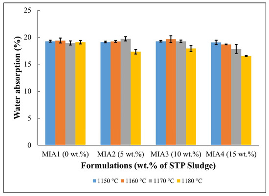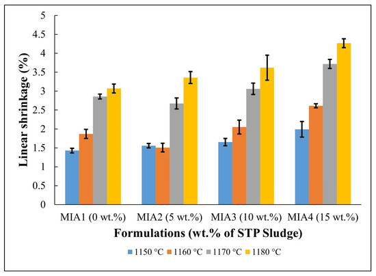 The linear shrinkage results of the produced red wall tile pieces are shown in Figure 5. Linear shrinkage values ranged from 1.40 to 4.27%, depending on the firing temperature and the amount of STP sludge added. It was found that both the firing temperature and STP sludge contributed to the increase in linear shrinkage. The increase in firing temperature enhances the sintering degree of the red wall tile pieces, particularly above 1160 °C. On the other hand, the incorporation of STP sludge as a substitute for limestone tends to increase the linear shrinkage value due to its chemical composition (Table 1). In fact, as shown in Table 5, the incorporation of STP sludge increases the amount of fluxing oxides (K2O, Na2O, and Fe2O3), which influences sintering behavior. Therefore, the linear shrinkage behavior aligns with the dilatometric curves (Figure 4).
