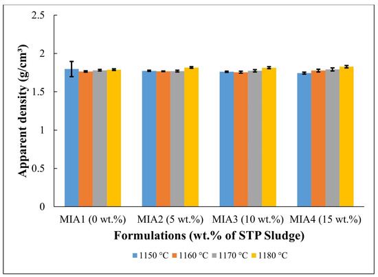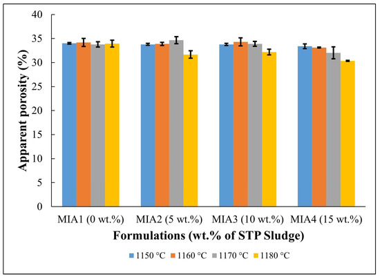 Figure 6 shows the apparent density of the red wall tile pieces. It can be observed that the apparent density of the pieces fired at temperatures between 1150 and 1170 °C presented only a small variation within the dispersion limits (1.74–1.80 g/cm3). At 1180 °C, however, higher apparent density values were achieved (1.79–1.83 g/cm3). This apparent density behavior can be attributed to several simultaneous and competing complex effects occurring during the firing process, including mass loss, mineral decomposition, crystallization of new phases, and sintering, which is typical of wall tile pastes [32,33,34,35,36,45].