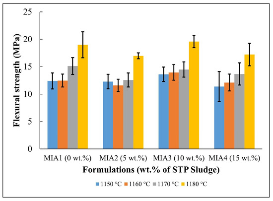 Figure 9 presents the flexural strength behavior of the fired red wall tile pieces. For better visualization, the flexural strength data are summarized in Table 7. Flexural strength values were established in the range of 11.37 to 19.59 MPa, depending on the firing temperature and the amount of STP sludge added. More specifically, it was noted that the flexural strength tended to increase with increasing firing temperature. On the other hand, it was found that at all firing temperatures, the effect of STP sludge incorporation on the flexural strength caused only a small variation within the dispersion limits. In addition, it is suggested that the possibility of formation of the anorthite phase, with greater mechanical strength [50], as described in the phase diagram in Figure 2, may also contribute to increasing the flexural strength of the red wall tiles produced. These findings are well correlated with water absorption (Figure 7) and apparent porosity (Figure 8).