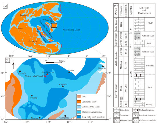 (a) Late Permian–Early Triassic (260–245 Ma) global paleogeography. (b) Late Permian Changhsingian paleogeography of South China showing the positions of studied section. (c) Stratigraphy and sedimentary facies of Permian in the Western Hubei Trough.