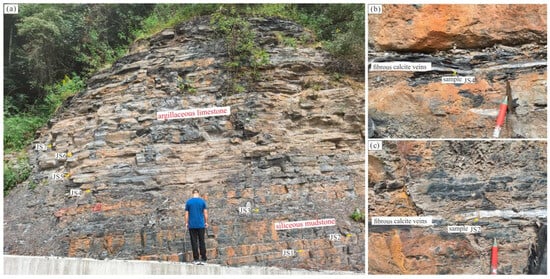 The study area is located in the village of Shiziping, 15 km north of Jianshi County. The fibrous veins of the Dalong Formation occur at the boundary between the top of the lower member and the upper marl. They display widths ranging from 0.5 to 4 cm and can extend over 10 m in length. These veins are uniformly distributed along the bedding planes within the outcrop, exhibiting a spacing of 10 to 30 cm. The host rocks primarily consist of carbonaceous mudstone, siliceous mudstone, and carbonaceous calcareous mudstone (Figure 2a). Although the stratigraphic dip of the section is generally gentle, instances of local bedding-parallel sliding and vein folding have been observed. Multiple layers of fibrous calcite veins were sampled for analysis (Figure 2a–c).