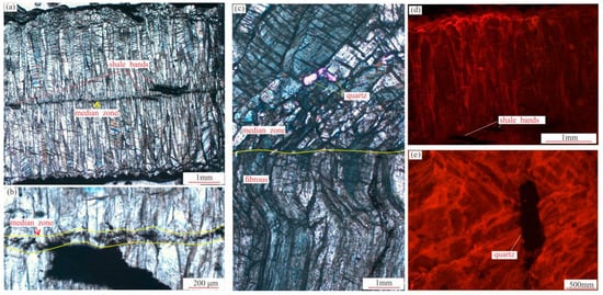 The fibrous calcite veins within the Dalong Formation exhibit an orientation parallel to the bedding planes. Notably, most veins feature a median zone (central line) that aligns with these bedding planes. Calcite fibers emanate continuously from the median zone to the vein margins, where they are oriented nearly perpendicular to the contact surfaces with the host rocks. The fibrous calcite crystals on either side of the median zone are nearly identical in length and width, exhibiting symmetry and a length-to-width ratio far exceeding 10 (Figure 3a). The central line, which is narrow and dark in color, is primarily composed of continuous bitumen veins or numerous hydrocarbon inclusions (Figure 3b). This median zone, measuring between 3 and 5 mm in width, predominantly comprises granular calcite with minor quartz crystal content (Figure 3c), while bitumen fills the interstitial spaces. Host rock bands are abundant in some samples, primarily extending parallel to the bedding planes, with a few intersecting at oblique angles. These shale bands exhibit widths ranging from 0.05 to 3 mm and lengths from 0.3 to 50 mm (Figure 3a), with the longest extending up to 8 cm. Calcite within the median zone and the fibrous calcite display a range of cathodoluminescence from bright to dark red, with no significant color variation observed along the crystal growth axis (Figure 3d,e).