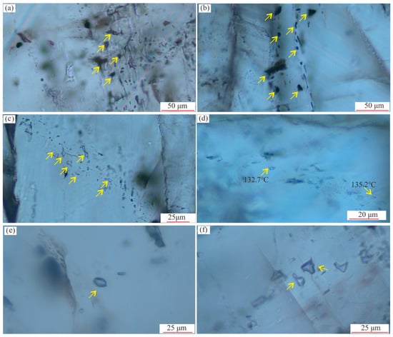 Petrography of fluid inclusions in calcite veins. (a) Hydrocarbon inclusions in median zone calcite (sample JS2), (b) hydrocarbon inclusions in fibrous veins (JS4 calcite), (c) pure aqueous inclusions in fibrous veins (sample JS4); (d) aqueous two-phase fluid inclusions in fibrous veins (sample JS2); (e) methane inclusions in fibrous veins (sample JS4); (f) methane inclusions in in fibrous veins (sample JS2). The yellow arrow indicates the inclusion.