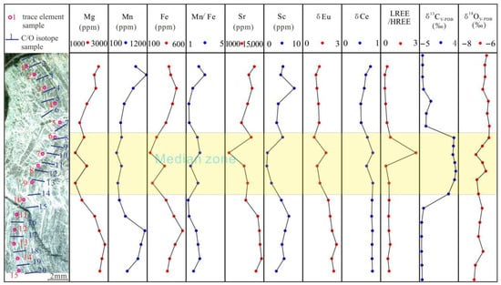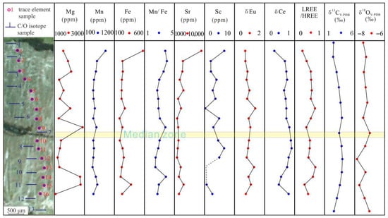 In sample JS-2, the iron (Fe) content ranges from 138.71 ppm to 555.37 ppm, while the manganese (Mn) content ranges from 336.04 ppm to 1177.65 ppm, yielding an Mn/Fe ratio from 1.21 to 2.93, with an average of 1.92. Conversely, in sample JS-4, the Fe content ranges from 120.47 ppm to 213.91 ppm, while Mn content ranges from 399.23 ppm to 873.53 ppm, resulting in an Mn/Fe ratio between 3.11 and 4.24, with a mean of 3.58. Sample JS-4 displays a higher Mn/Fe ratio and lower Fe content in comparison to JS-2 (Figure 6 and Figure 7). The magnesium (Mg) content in JS-2 fluctuates from 1304.74 ppm to 2825.53 ppm, gradually decreasing from the median zone to the fibrous calcite on either side. Similarly, overall trends for strontium (Sr) and scandium (Sc) coincide with those observed for Mg (Figure 6 and Figure 7). In JS-4, Mg content ranges from 1080.03 ppm to 2877.58 ppm, revealing no distinct trend from the median zone to context with fibrous calcite. Sr and Sc do not demonstrate a consistent trend and are uncorrelated with Mg (Table 1; Figure 6 and Figure 7).