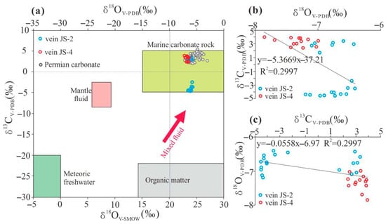 Carbon and oxygen isotopic compositions and diagenetic fluid sources of the calcite veins and surrounding host rocks. (a) Plot of C versus O isotopes. Mantle fluid data are from Hugh and Taylor (1974) [6]; Permian carbonate data are from Shen et al., 2013 [33]. (b,c) Comparison of the C and O isotopes for the veins.