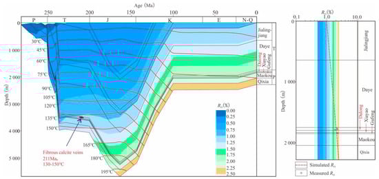 Observations of fluid inclusions indicate that samples JS-2 and JS-4 display consistent inclusion types, predominantly hydrocarbon inclusions. Notably, there is no significant difference in inclusion types between the median zone and fibrous calcite within sample JS-2. The similar homogenization temperatures of fluid inclusions across different samples imply that fibrous calcite veins formed nearly simultaneously. U-Pb isotopic dating of sample JS-4 reveals that the veins originated during the Middle Triassic (211 Ma), corresponding to a burial depth of approximately 3500 m for the Dalong Formation, with a maturity Ro range of 1.00% to 1.25%, denoting the primary oil generation stage (Figure 10). Consequently, the formation of fibrous calcite veins is synchronous with the main oil generation phase of the shales.