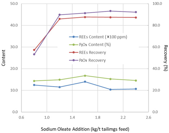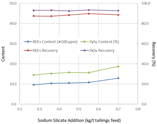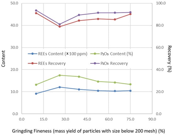 The pre-concentration step removed up to 87.49 wt% of the solids from the feed, yielding a concentrate with significantly higher REE and P2O5 contents compared to the original tailings. However, the recoveries of REEs and P2O5 were relatively low—40.73% and 33.12%, respectively. These results suggest that a substantial portion of the valuable minerals in the amine flotation tailings exist as fine particles interlocked with gangue minerals. Without sufficient grinding to liberate these minerals, effective separation cannot be achieved.