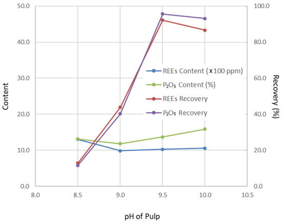 Change in flotation results with pH of pulp (grinding fineness 52.70 wt% of −200 mesh particles, depressor addition 0.5 kg/t tails feed, collector addition 1.2 kg/t tails feed).