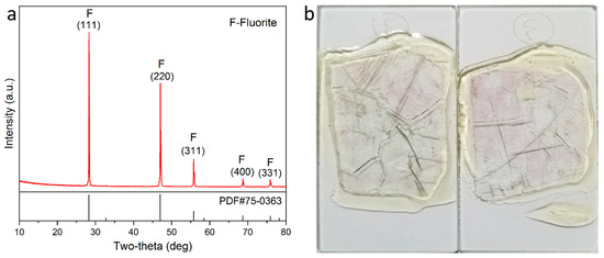 XRD pattern (a) and thin sections (b) of the fluorite.