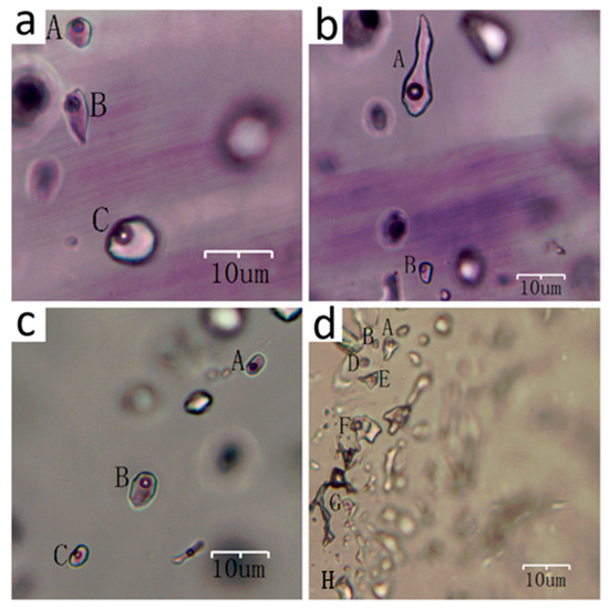 Microphotographs of typical fluid inclusions (A–H) in fluorite ((a) field of vision 1; (b) field of vision 2; (c) field of vision 3; (d) field of vision 4).